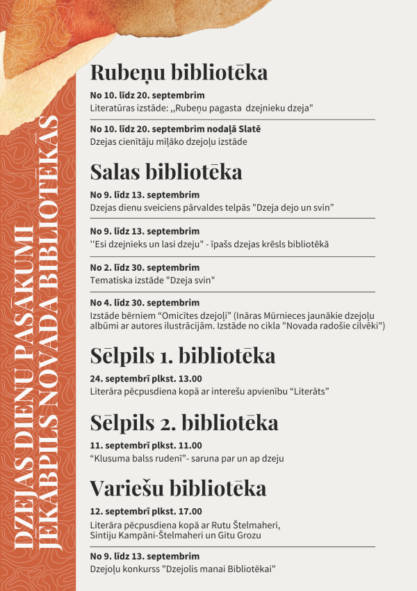 Arī šogad plašu Dzejas dienu pasākumu programmu Jēkabpils pilsētā organizē Jēkabpils novada Galvenā bibliotēka un Jēkabpils pilsētas bibliotēka.